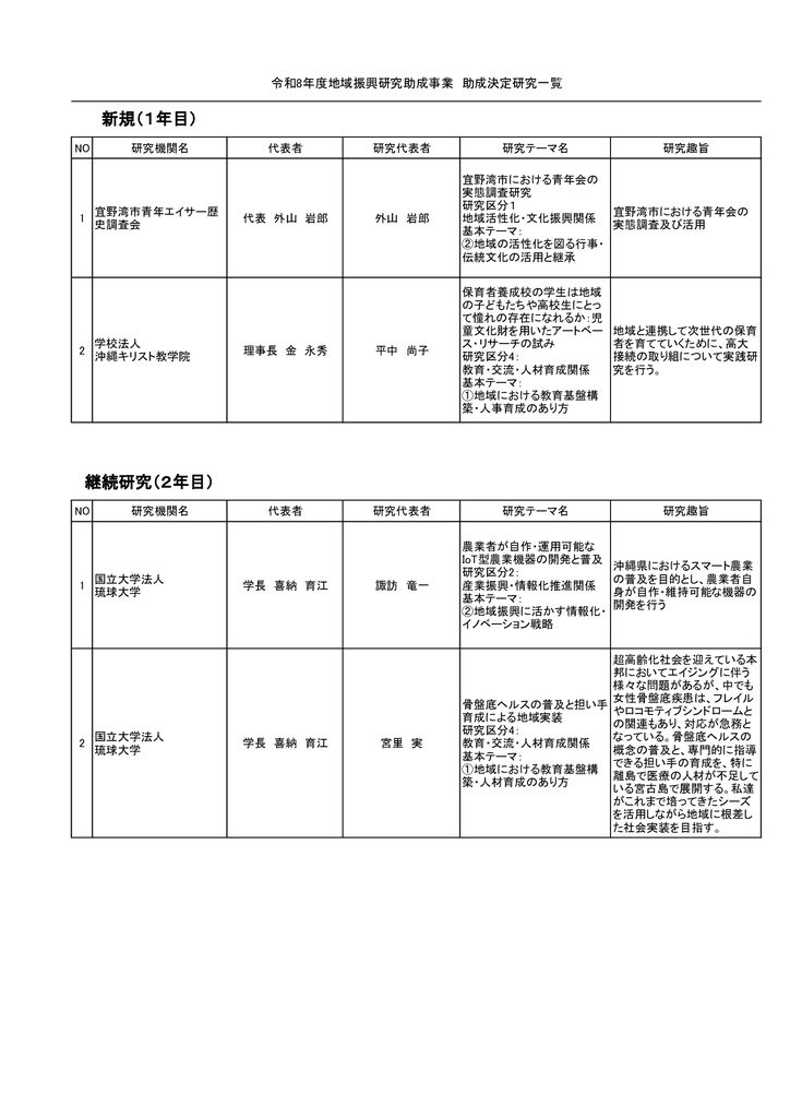 沖縄県地域振興協会は、標記事業に係る公募を実施し、以下のとおり助成先を決定いたしました。